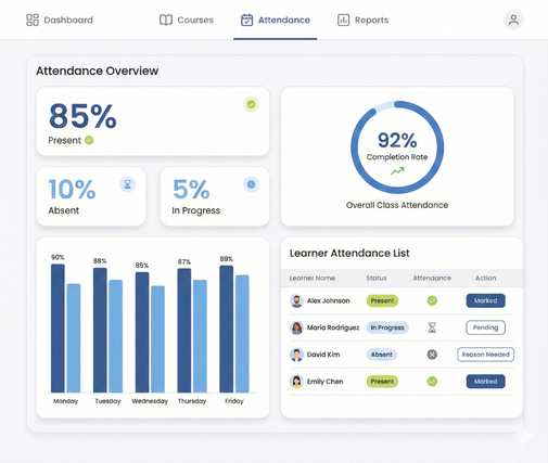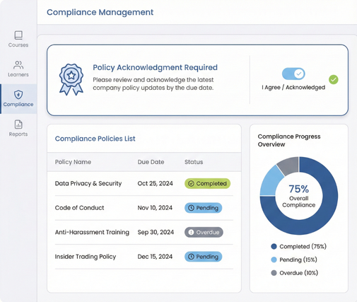 HR and L&D teams struggle to track who has completed training, who is pending and who needs retraining in real time.