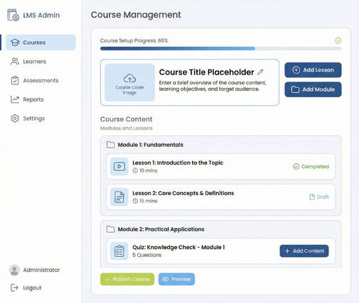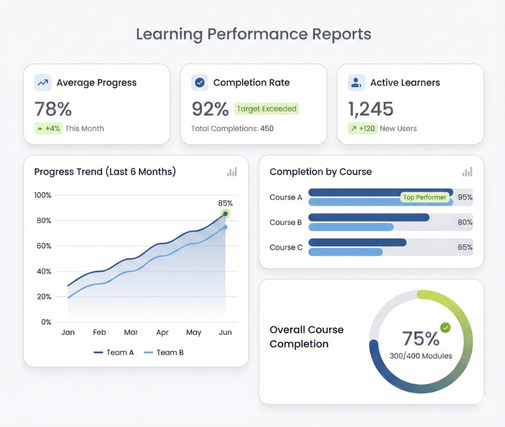 Track learning progress, monitor completion status and evaluate assessments in real time with complete visibility.