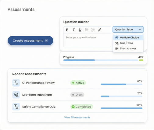 Run tests, measure knowledge, evaluate skills and check learning effectiveness with simple assessment tools.